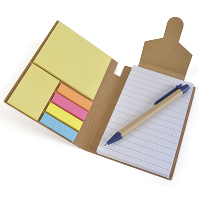 A6 notebook with 80 lined sheets, natural top flap, pen with blue ink, yellow sticky notes and flags in neon orange, pink, yellow and blue.