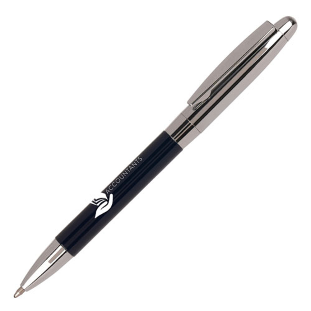 A twist action ball pen with two tone chrome accents and a great print area to the lower barrel.