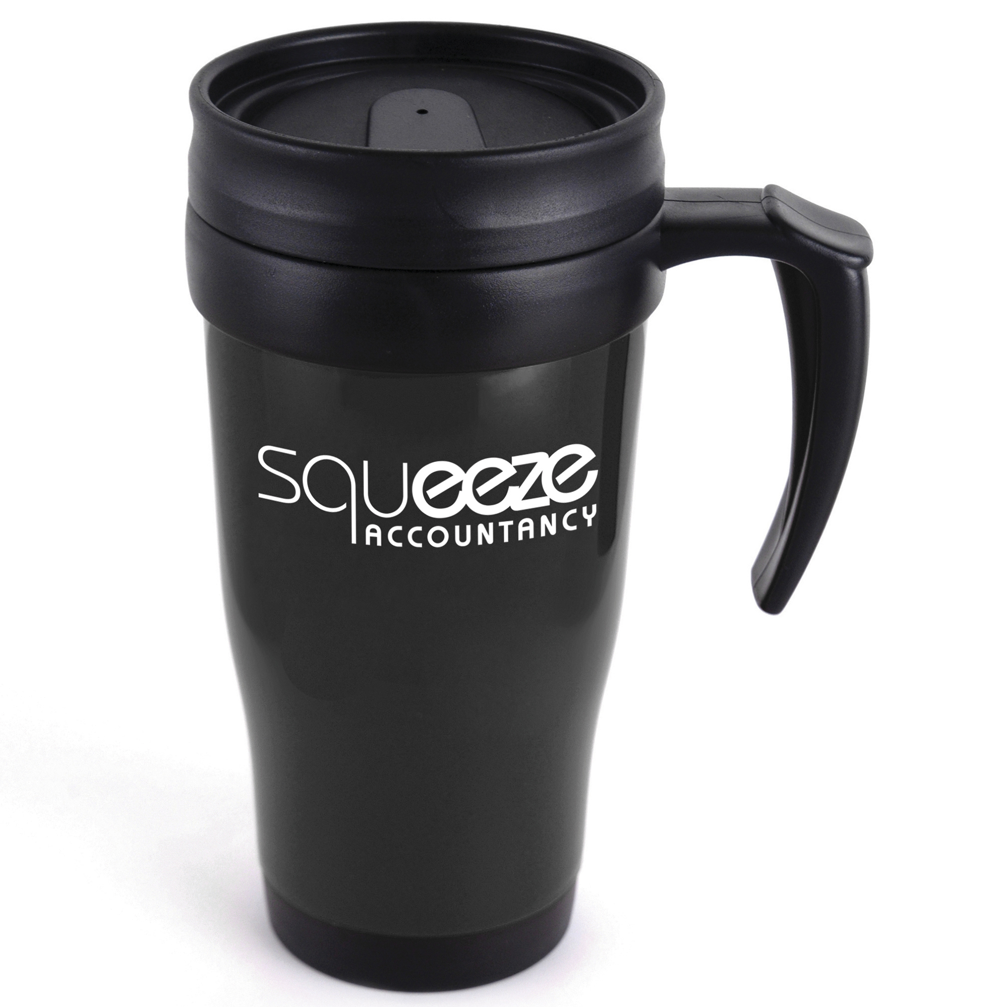 | MG0192BK | 'Polo Plus' 400ml Plastic Solid Coloured Travel Mug in BLACK | 11486 |